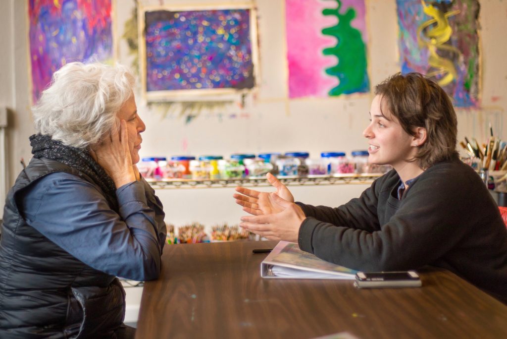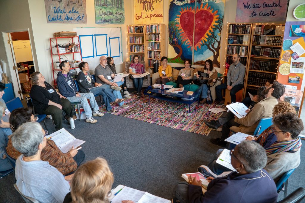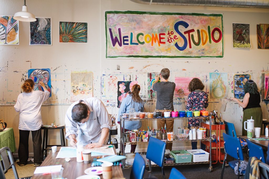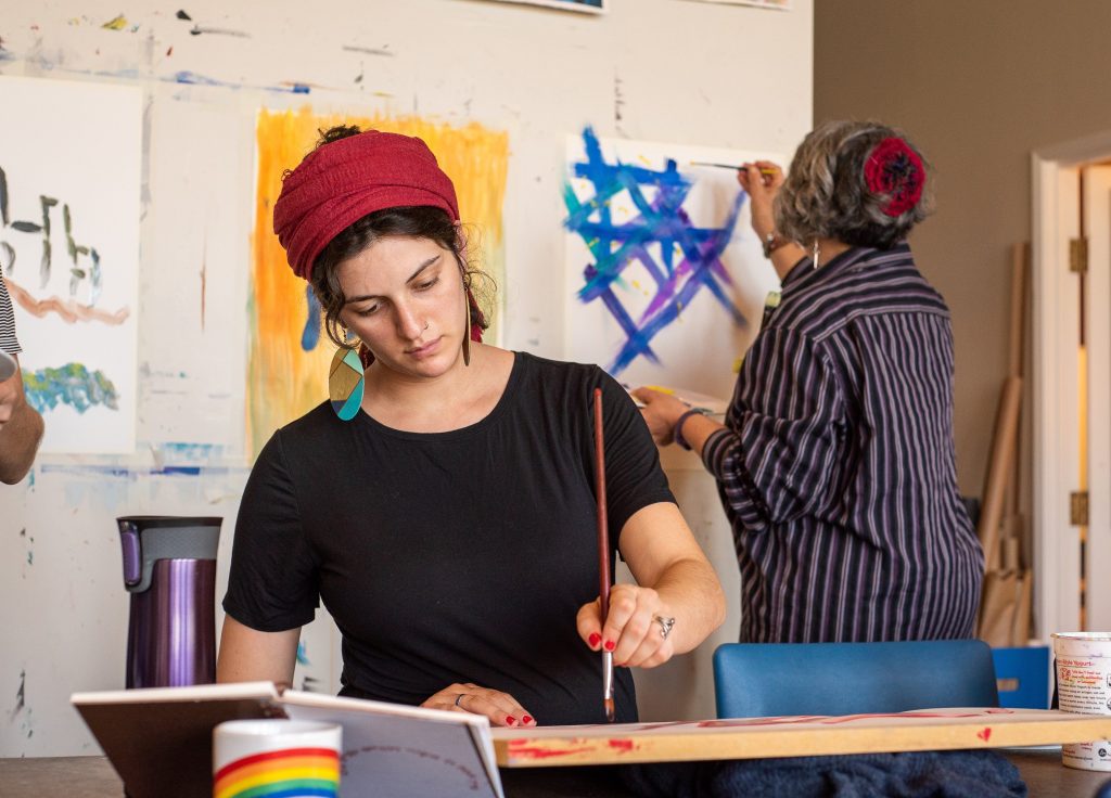 The walls of the JSP Berkeley studio are decorated with the “Torah of Creativity,” the four foundational principles of JSP, each corresponding to a phrase from Jewish text: Humans are created creative (b’tselem Elohim); creation comes from chaos and void (tohu va’vohu); nothing is ever just one thing (hafoch bah); we are called to journey into the unknown (lech l’cha); God is process (ehyeh asher ehyeh). R’Adina believes that when we bring our creative energy into a world full of chaos and void and imagine something that doesn’t yet exist, “New worlds are born. Our creative energy is hopeful and powerful.” Even doing the Jewish Studio Process a single time, according to R’Adina, “has the potential to unlock and open, leading a person down new paths.”