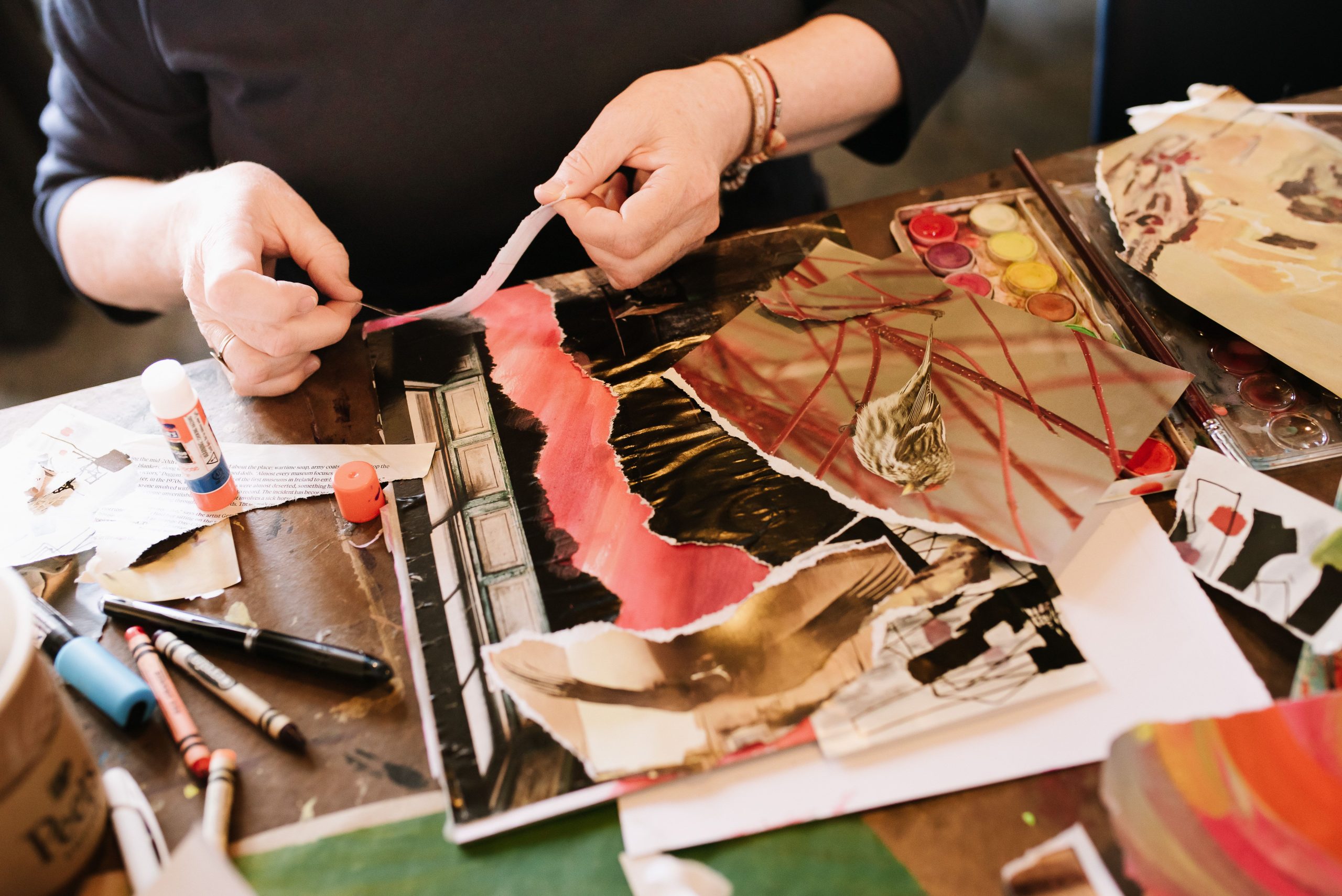 Engaging with text and making art are two of the four specific steps of the JSP process: inquiry, intention, creative exploration, and reflection. A session typically starts with a trained facilitator sharing a piece of Jewish text and other texts (which may or may not be Jewish) on a particular theme. Participants then engage in chavruta study (talking with a partner) about the texts. After the group comes back together to share what they have uncovered, each participant sets an intention, using a verb in the present tense such as “I explore” or “I discover” or “I let go of…”