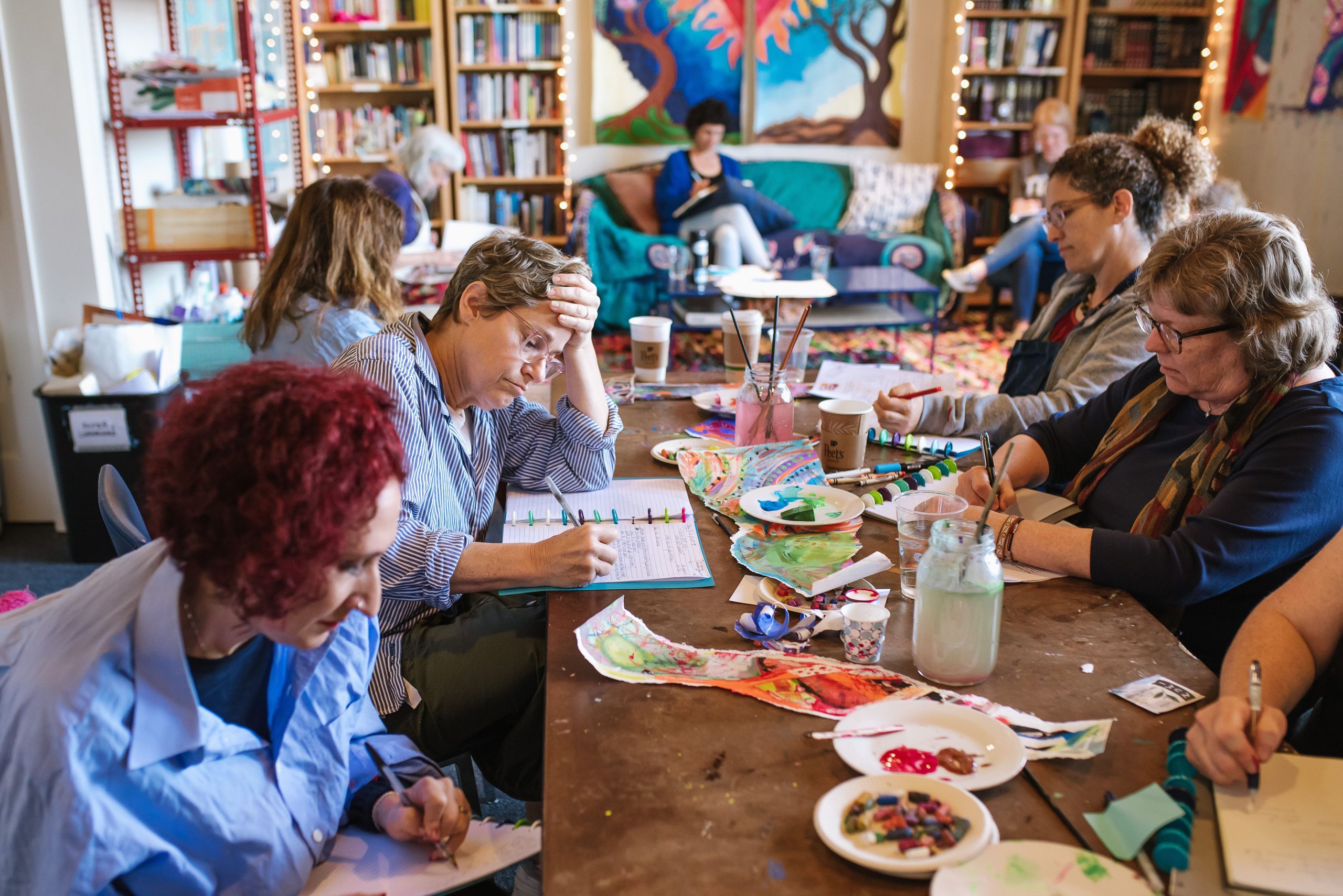 The walls of the JSP Berkeley studio are decorated with the “Torah of Creativity,” the four foundational principles of JSP, each corresponding to a phrase from Jewish text: Humans are created creative (b’tselem Elohim); creation comes from chaos and void (tohu va’vohu); nothing is ever just one thing (hafoch bah); we are called to journey into the unknown (lech l’cha); God is process (ehyeh asher ehyeh). R’Adina believes that when we bring our creative energy into a world full of chaos and void and imagine something that doesn’t yet exist, “New worlds are born. Our creative energy is hopeful and powerful.” Even doing the Jewish Studio Process a single time, according to R’Adina, “has the potential to unlock and open, leading a person down new paths.”